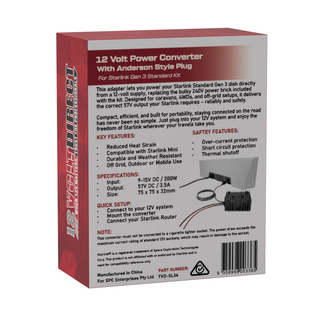 12 Volt Adapter for Starlink Standard Kit V3 Step Up 57V Voltage Booster Power Supply with Anderson Plug Brand: 12 Volt Direct SKU: TVD-SL34