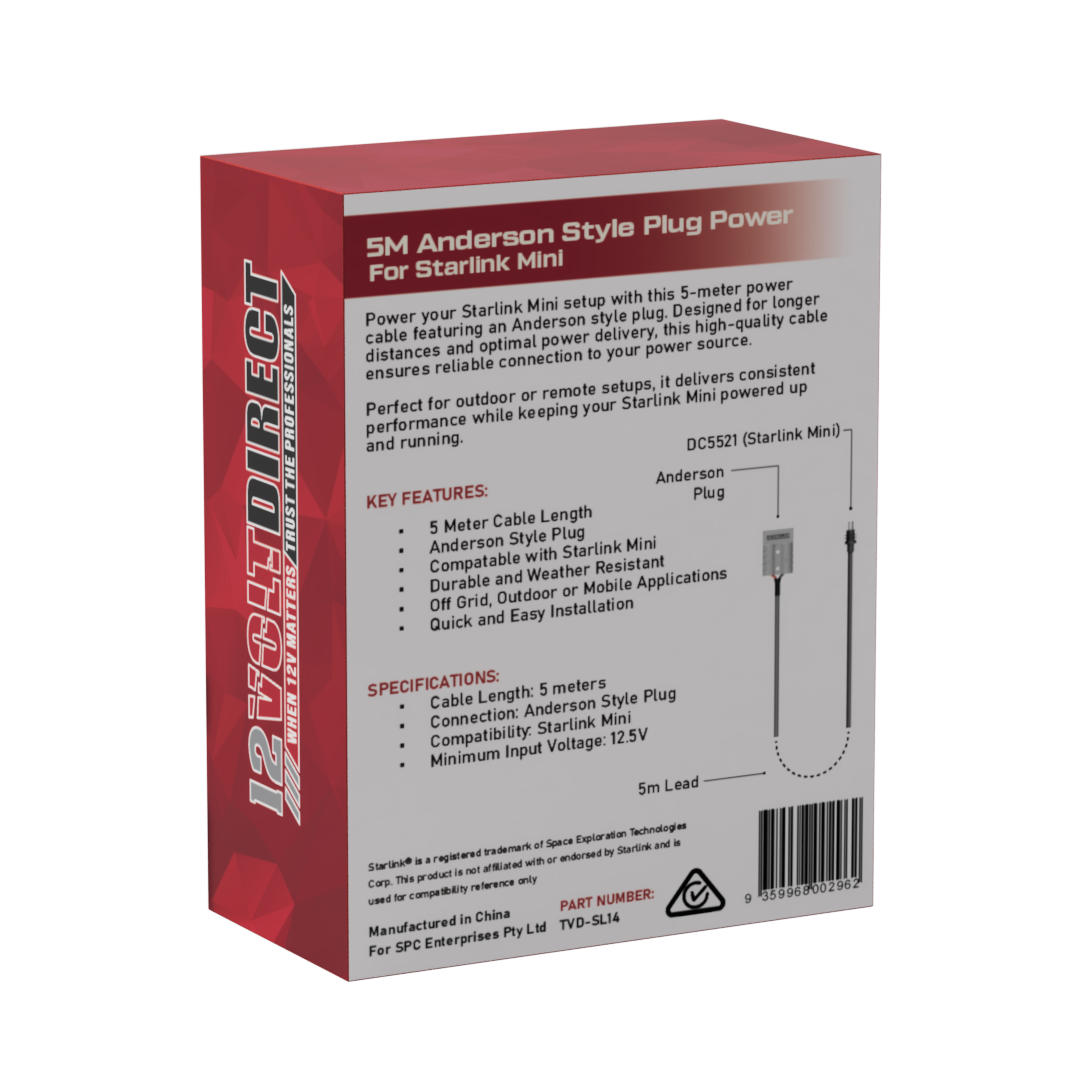 Starlink Mini Power Cable to Anderson Style Plug 5 Meters Brand: 12 Volt Direct SKU: TVD-SL14